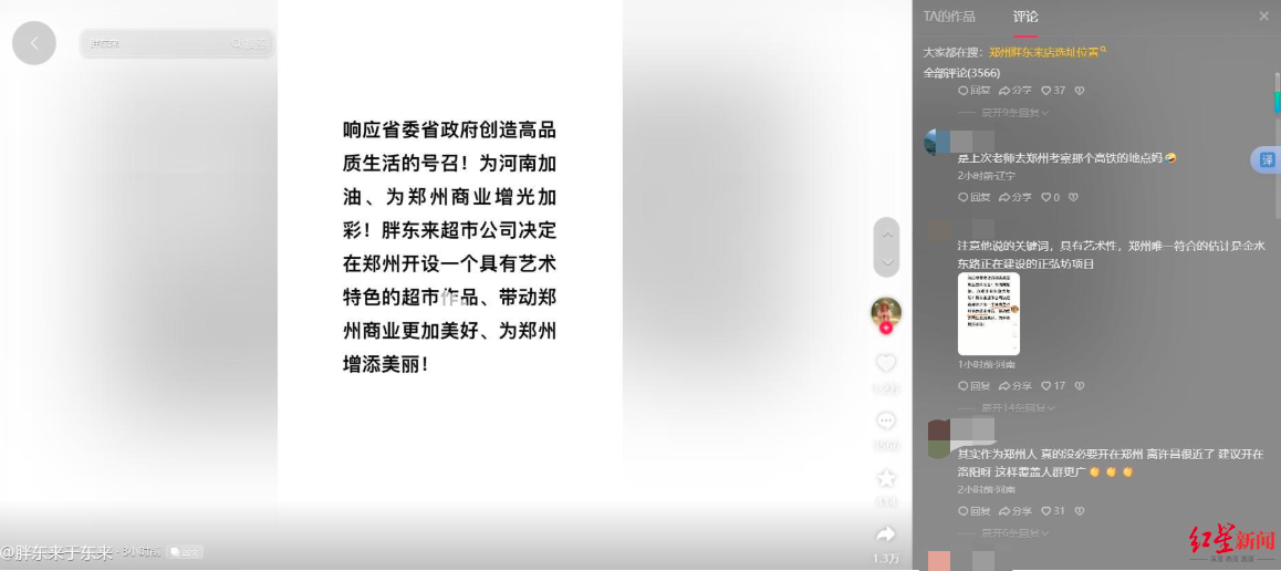 2月23日,胖东来创始人于东来在社交媒体发文称:“胖东来超市公司决定在郑州开设一个具有艺术特色的超市作品、带动郑州商业更加美好、为郑州增添美丽!”